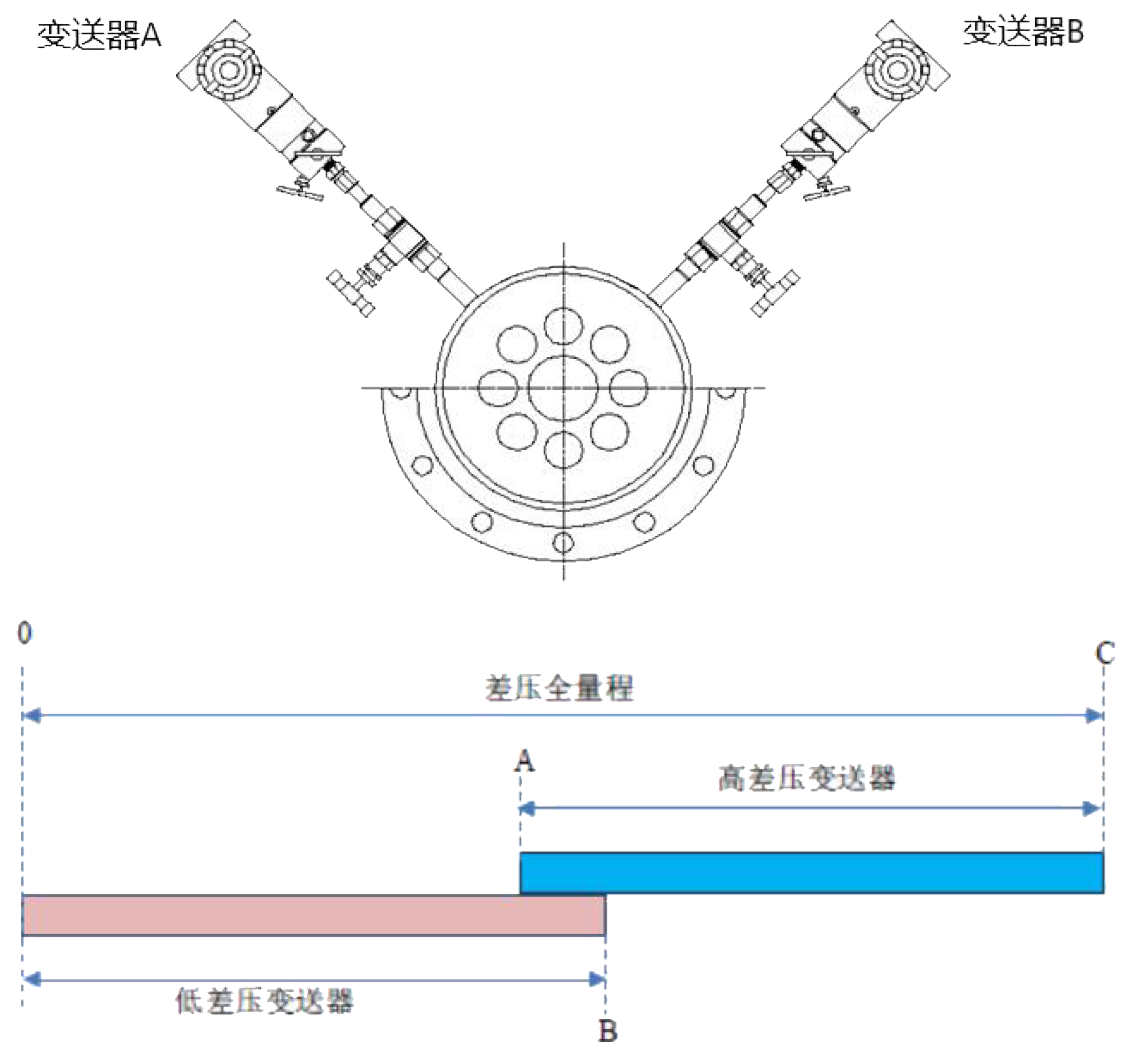 分別將大量程變送器及小量程變送器測(cè)量信號(hào)引入DCS系統(tǒng),通過(guò)上位機(jī)編程實(shí)現(xiàn)大、小量程切換,完成流量監(jiān)測(cè)及累計(jì)。自動(dòng)切換可利用小量程變送器的上限電流值作為判斷條件:例如把A、B兩路變送器的測(cè)量信號(hào)分別引入到DCS系統(tǒng)中,在DCS系統(tǒng)中的同一點(diǎn)C處顯示輸出流量值。以小量程變送器B的輸入信號(hào)為切換點(diǎn),當(dāng)檢測(cè)到小量程變送器B輸入信號(hào)>19.8mA時(shí),切換到大量程變送器A,在C點(diǎn)顯示大量程變送器A的測(cè)量流量,小量程變送器B流量指示屏蔽;當(dāng)檢測(cè)到小量程變送器B輸入信號(hào)≤19.8mA時(shí),切換到小量程變送器B,在C點(diǎn)顯示小量程變送器B的測(cè)量流量,大量程變送器A流量指示屏蔽。