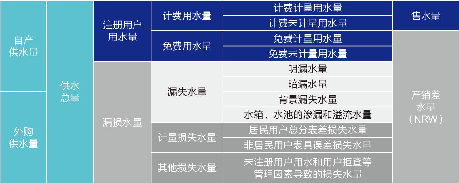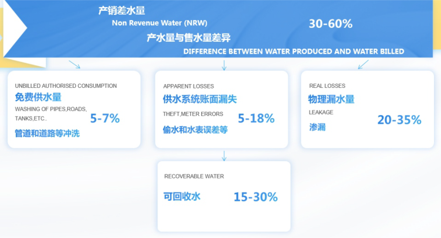 產(chǎn)銷差水量 = 免費供水量+物理漏水量+帳面漏水量